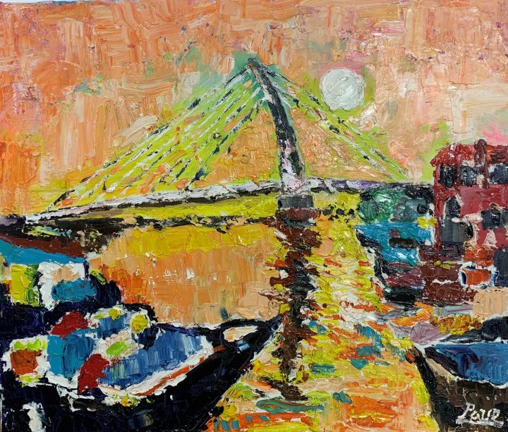 如夢中的場景浮現出來一般,類似抽象綜合寫實的畫風,中間的牆上掛著太陽,運河上的船隻來來往往,有貨運有遊客,也有各自的小船,現在台陽準備下山了,映照的日落河岸發出燦爛的光芒。