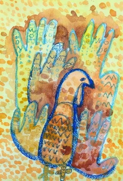 難得的孔雀開屏,讓人屏息以待,畫家用自己的手為範本,描繪這幅孔雀開屏,在無數的點點組合之下,展現生動又活潑的色彩。